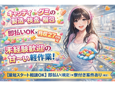 食品製造|キャンディ・グミの検査・梱包/月27万可・即払いOK・寮完備