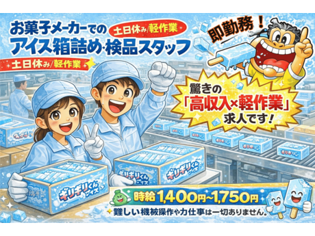 お菓子メーカーのアイス箱詰め・検品|月収26万~|スピード採用・即入寮・土日休み